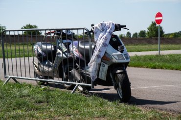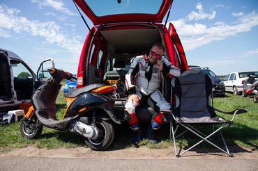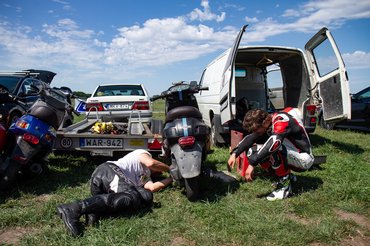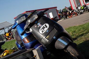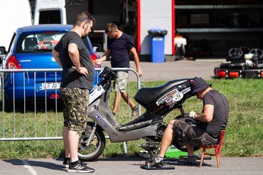 A stresszmentesség közel sem jött össze, a TB24 edzés előtti napon este tízkor nekiláttam feltenni a Quartzra a féknyerget és a másodjára is felújított főfékhengert. Aztán amikor raktam vissza a kereket megismerkedtem a felni kitekeredett tőcsavarjával is - hatalmas szerencsém volt, hogy Stump Bandi éjszaka pont erre járt, hogy bedobjon pár motyót, ami másnap jött velünk. Addigra már Filep Tomival bepakoltunk két robogót a furgonba, és nagyjából éjfélre a harmadik is összeállt. Az előző éjszakáim is erről szóltak, öt óra alvásokkal, de tudtam: a sors a nagy pillanatoknak megkéri az árát, semmmi nincs ingyen. A robogóversenyző-legenda Ráski Robitól hétfőn kaptam meg az okosított blokktartó segédvázat, annak a berakása is kétemberes meló volt, a kanyarban leérő, a vázhoz hegesztett kókány oldaltámasz levágása sem adta magát csak úgy (a flex nem fért oda, roncsolni meg nem akartunk), ráadásul nem csak úgy oda volt hegesztve, hanem egy berohadt csavart is ki kellett imádkozni melegítéssel és ütéssel. De nem panaszkodtam, tudtam, hogy miért történik mindez. Csak ismételni tudom, a felejthetetlen élmények be vannak árazva, és természetben kell fizetni.