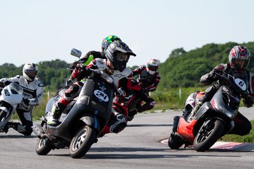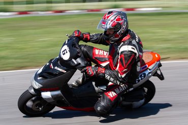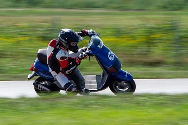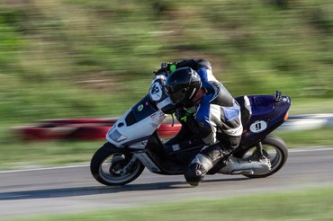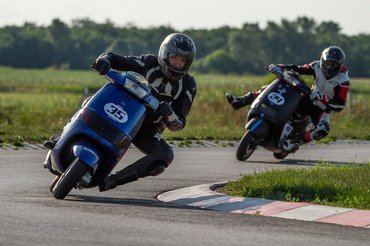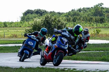 Szerda reggel már-már szürreálisan flottul ment minden, az összes robogó összepakolva, minden cucc megvan, és időben le is értünk a SER-Ringre, ahol az adminisztráció után már húzhattuk fel a bőrt. Nem készültem nagy tömegre, a hétköznapi időpont miatt legfeljebb 10 robogóra készültünk, így meglepett, hogy a pálya parkolója szinte tele volt. Utcai motorosok, supermotósok, pályázók - vegyes társaság. Engem alapvetően nem zavar, a színes közönség pár felmenetel alatt összerázódik, az utcai csávók felveszik a pálya ritmusát, a nagyobb motorok megtanulják, hogy az ötvenesek csak kanyarban mennek, egyenesben szinte állnak, tehát ha csak kicsit gyorsabbak, akkor ott kell előzni, ha pedig lassabbak, elveszik egy kicsit, hogy ne tartsuk fel egymást. A pályapitonoknak meg mindegy, ha csak résnyire nyitott ajtót látnak, már át is bújtak.