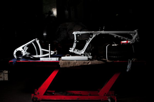- Semmi, legfeljebb a derekam, ami most tűrhető, de néhány napja még lábra állni sem tudtam. Viszont jön Csamangó barátom meg Viktor, és majd hárman együtt összerakjuk. Így is bámulatos Tibi türelme, ezért szeretném, ha mielőbb motorozhatna még vele. A vázon levő gyári lemezkék azért kicsit megvicceltek, vagy inkább a szemem, mert a kis szegecseket már csak az anyámtól örökölt űrteleszkóppal (a Mester mamájának egykori rózsaszín olvasószemüvege) láttam, ezért azokkal eljátszottam egy ideig. Végül a fényezés előtt körberagasztottam. A matricákat Viktor intézte, és természetesen mind gyári, hiszen azok hologrammal vannak védve. A légszűrőcsöveket Kokó barátom hegesztette össze, amire különösen büszke vagyok, mert a Műegyetemen tart gyakorlati órákat hegesztésből.