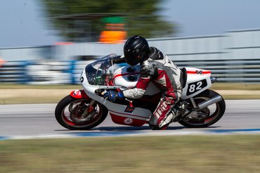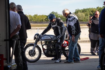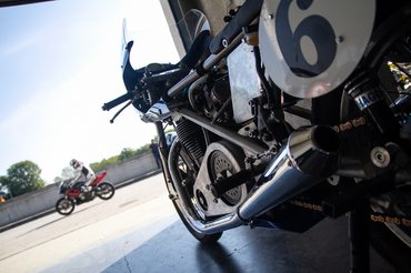 Az egyhengeres versenymotor elképesztő robajjal kelt életre, mintha minden más, a Morini Corsarók, az RD Yamahák, a Suzuki RGV, a Pannóniák hangtalan villanymotorok lennének. Még csak ráfordult a célegyenesre, de a pálya másik végén hallottam, hogy magasabb fokozatban van az ideálisnál - Tamás kímélte a váltót, két kör után már egy bovden is szabadon lobogott a motor alatt, de ő nem időre ment, hanem tiszteletköröket, levezetni egy stresszes nap végén.