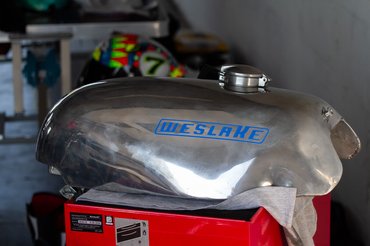Mire a történet itt tartott, már el is dőlt, hogy mi lesz a blokkal - Góczáéknál ugyanis akadt egy Seeley váz, amibe eredetileg egy 750-es Norton Commando blokkot szántak volna. A Seeley egy angol vázmanufaktúra, ahol eleve az ottani egy- és kéthengeresekhez terveztek vázakat, és mivel a Weslake blokkokat eleve úgy építették, hogy be lehessen őket tenni a Triumph blokkok helyére, a Seeley-be is probléma nélkül bement. A váz egyébként kakukktojás, ugyanis itthon készült. A mintát hozzá az idősebb Nyitray adta, a kivitelezést pedig Kinczel Csaba végezte - őt csak hírből ismertem, a munkáit viszont már több alkalommal megcsodálhattam, az ő építéseit egyáltalán nem túlzás világszínvonalúnak nevezni. A váz mellett a tank is az ő keze munkája, és kedves apróság, hogy Csaba és az ifjabb Nyitray, akiről már portrét is írtam, mind a ketten kint voltak a pályán, ők ugyanis az MZ Kupában indulnak.