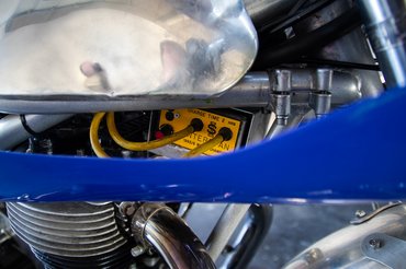 Átdolgozták a kenést, Norton olajpumpa került bele, hogy nagy fordulaton is jól működjön, átalakították a vezérlést, illetve alu hengerek kerültek fel öntöttvas persellyel. És erre jött rá koronaként a négyszelepes hengerfej, akkoriban ez még a versenymotorok kiváltsága volt, és a Weslake ebben volt a legnagyobb, a Formula-1-es tapasztalataikat felhasználva alakították ki a kis szelepszögeket és a nagyon kompakt égésteret. Ahogy a tulajdonos felhívja rá a figyelmet, ez a megoldás kompromisszumokkal jár, ugyanis eltér a szelepek elmozdulási iránya a himbák nyitási irányától, ezért a szelepvezetők egyik fele nagyobb terhelést kap, és ott bizony kopással kell számolni. Ami egy versenyblokknál apróság, nem tartósnak kell lennie, hanem erősnek: 500 köbcentivel 60 lóerőt tudott, míg az alkohollal hajtott, 950 köbcentis csúcsmodell 120 lóerőt adott - ez azért ma sem hangzik rosszul.