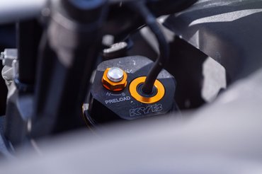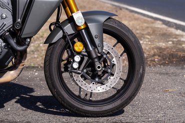 Elöl a kifelé és befelé csillapítást is állítja, hátul csak az utóbbit. A rugóelőfeszítést elöl szerszámmal, hátul továbbra is kézi kerékkel lehet tekergetni a hátsó gátlón – nyilván kevésbé kényelmes, mint gombnyomásra, de ezzel súlyt és hibalehetőséget is spóroltak. A legfontosabb, a csupaszoknál hosszabb rugóúttal közepesen hitvány útviszonyok mellett is élvezhetővé teszi a motorozást, de egy kiváló szerpentinen sem fog letérdelni a kemény féktávoktól és kigyorsításoktól. Én a Bridgestone T30 helyett tennék rá valami sportosabb abroncsokat, mert a futómű mellett a fék is szinte sportmotoros hatékonysággal támogatja a kanyarvadász üzemmódot.