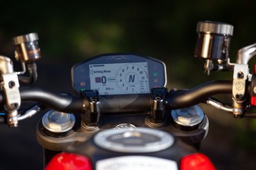 Az alap elektronikai csomag kategórián felüli: konfigurálhatod a teljesítményleadást három állásban, a kanyar ABS-t szintén háromban, a dőlésszögérzékeny kipörgésgátlót nyolc, az egykerekezés kontrollt négy fokozatban. Az igazi hülyegyerekeknek ráadásul ott van a rajtautomatika is. Gyors egymásutánban csak háromszor enged elrajtolni vele, feltételezem ezt a 1,5 kilóval könnyebb tengelykapcsoló védelmében teszi. De a finom elpattintástól a limiteren dadogásig három állásban szabhatod meg, mennyire sietsz. Elsőre szürreális, aztán adja alád a lovat, és azon kapod magad, hogy Tihanynál a kompra felhajtáshoz is jól jöhet, hogy tuti helyed legyen.