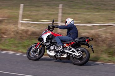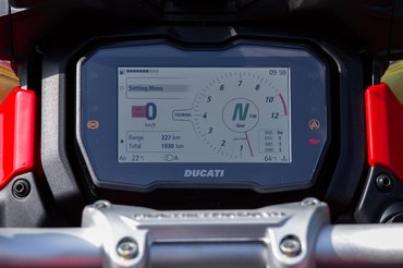 Nagy reményekkel ültem az új Multistradára, ettől a modelltől valahogy mindig sokat várok. Ha a most akciós hétmilliót is nézem, legyen már tartása az embernek, és várja, hogy ennyi pénzért kilóra megvegyék. Az első benyomás az előző modellel ellentétben teljesen más volt, és amíg az elődhöz szokni kellett, itt azonnal megvolt a kémia, nem éreztem, hogy bármit állítani, vagy bárhol matatni szeretnék. Kezdve az üléspozícióval, amely az elődhöz képest másfél centit emelkedett, és maradt még így is plusz két centi állítás felfelé, ezért a százkilencven centis magasságom okozta korábbi térd-könyök koccanás végleg eltűnt, és az állítható szélvédő gyári hangolása is megfelelő volt, a szélszaggatás nagy tempónál sem piszkált.