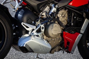 Ennek az aszfaltra juttatását segíti a „twin pulse” gyújtássorrend (0-90-290-380 fok). Leegyszerűsítve a történetet, először a bal oldali hengerek gyújtanak, majd jobb oldalon megy végbe az égés. Utána a hetvenfokos csapszeg-elékelés miatt majdnem egy egészet forog a főtengely gyújtás nélkül, hogy a különleges méretű (200/60 R17) hátsó guminak legyen ideje magához térni – hasonlóan a Yamaha big-bang blokkokhoz. Azonban a japán crossplane sornégyes a klasszikus V4-esek karakterisztikáját hozza, a bolognaiak V4-ese inkább a V2-esek működéséhez áll közelebb.