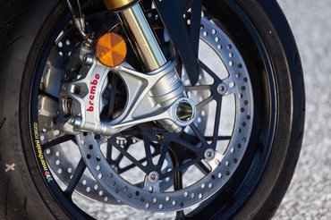 Idom híján nincs, ami takarja az elektronikusan vezérelt Öhlins gátlókat, amiket oldalanként három csavarral szorít a masszív alsó villahíd. Az aluváz még a V2-es 1199 Panigalén jelent meg, és a kilencvenfokos V4-esnél is ezt a megoldást alkalmazták. A japán konkurensek vagy az Aprilia hagyományos hídvázával ellentétben itt maga a blokk a fő teherviselő elem: az öntött alumínium egység csak a villanyakat köti össze a blokkal, amihez közvetlenül kapcsolódik a lengővilla. Ezzel a megoldással nagyon könnyű és kompakt motort lehet építeni, habár igen nehéz feladat a torziós szilárdságot méretezni. A szokásos top Brembo nyergek és mart alu Marchesini felnik veszik körbe azt a blokkot, ami néhány évvel ezelőtt páros lábbal rúgta fel a bolognaiak motorépítési hagyományait.