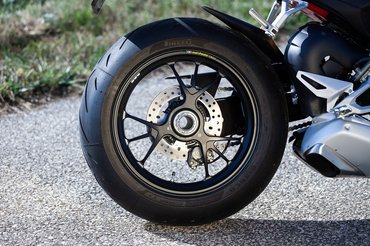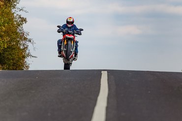 De nem csak a dragster üzemmód áll jól Dukinak, el is lehet kanyarodni vele. Hogy a viharba ne lehetne, hiszen a futómű és a fék is a nagy szériában elérhető legjobb motyókat vonultatja fel. Az elektromos félaktív Öhlins rendszer a finom visszajelzések mellett megadja a választás szabadságát is, nem csak kiváló útminőség mellett teszi élvezhetővé a motorozást. Természetesen az IMU-val együttműködésben variálja a csillapítást féktávon vagy kigyorsításkor. Utcán gyakorlatilag észrevehetetlen a működése, annyira jól alád dolgozik. És a menüben való beállításokhoz sem kell informatikusnak lenni. A Brembo Stylema féknyergek hatásfoka már sok motoron bizonyított, az ABS intenzitása szintén állítható, mint ahogy a kipörgésgátló és a motorfék hatása is ezerféleképpen variálható.