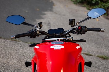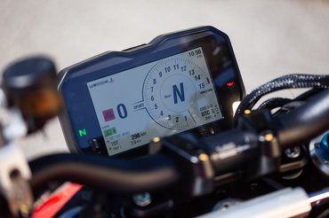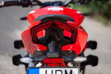 Míg a Panigale V4 éles vonalaiban van egyfajta elegancia, az idomoktól megfosztott utcai harcos maga a mosdatlan agresszivitás. Ezen ülve tuti nem fognak beszólni a piros lámpánál, senkinek sem hiányzik bökő a hátába. Pedig alig van rajta idom, amit formatervezni lehet – mégis egyszerre homogén, funkcionális és jellegzetes az egész megjelenés. Igen, a szárnyak is: huszonnyolc kilónyi leszorító erőt termelnek kétszáznál, így nem kellett hosszabb lengővillával ártani a fordulékonyságnak. A fényezett műanyagok mellett azonban itt leginkább a pőre technika eteti a szemet.