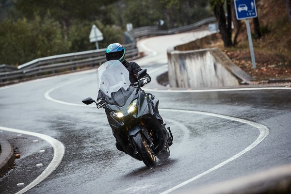 A blokkhoz érdemben nem nyúltak, maradt az 560-as soros kéthengeres (pontosan: 562 köbcentis), 47 lóerővel és 55,7 Nm-rel. Teljesítményből egészen biztosan többet is ki tudtak volna hozni, de így fér bele az A2-es kategóriába, amibe például a legerősebb ellenfelet, a Forza 750-es csak fojtással lehet belekényszeríteni. Megértem, hogy nem törték össze magukat még öt lóerőért: lényegében egyetlen érdemi konkurens van jelenleg a piacon, a Honda Forza 750, hasonló áron is mérik őket, a döntés így inkább érzelmi alapon zajlik: duplakuplungos Hondát szeretnél, vagy CVT-s Yamahát?