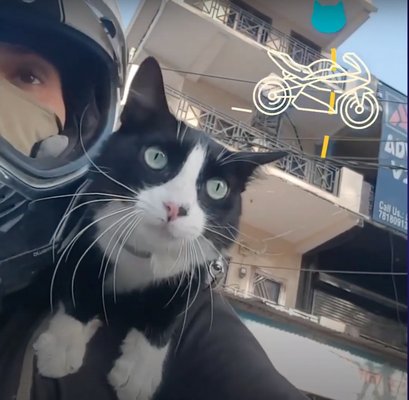 A motoros a tanktáskába rakta a kismacskát, ahol az első negyedóra után már tökéletesen komfortosan érezte magát. Ahogy a srác mondja: a cica rájött, hogy ez egy biztonságos hely. A következő szállásra már együtt mentek és közben olyan barátság alakult ki köztük, hogy innentől együtt motoroztak tovább. A vékony kiscicából felnőtt macska lett, de szemmel láthatóan az idő előre haladtával se unt rá a motorozásra.