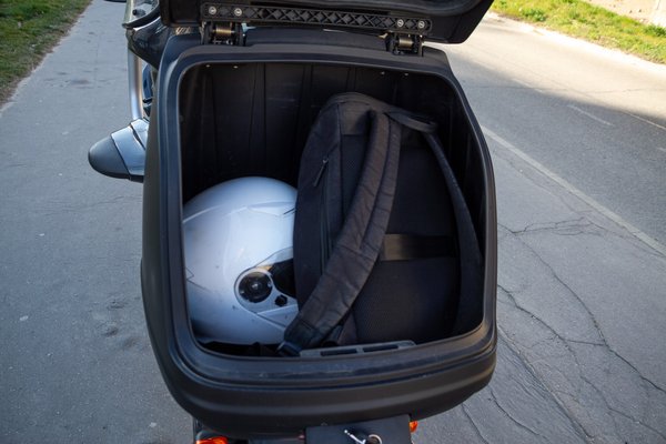Esőben viszont nagy király leszel. Nem hittem el, hogy teljesen száraz ruhával le tudok hozni egy 15 kilométeres kört végig közepes esőben, de majdnem sikerült, a megálláskor lerakott lábam miatt lett kissé nedves a farmer szára, illetve pár csepp került a kesztyűmre, de ennyi. Sokan szerelnek még rá térdmelegítő Tucanót, és kézzsákot, el tudom képzelni, hogy nagyobb hidegekben, hosszú távokon lehet haszna. Van ablaktörlő, sőt, ablakmosó is, a szélvédelem lábnál és felsőtestnél egyaránt pazar, jól felöltözve akár a fagypont környéke is vállalható vele, pedig normál esetben nem nagyon ülök 10 fok alatt motorra. A szokatlan kényelmi extrák listáját az ülésfűtés és a belső világítás teszi teljessé az Executive modell esetén, sőt, gyári telefontartó is van, persze nagyjából Nokia 6310-re méretezve, így 2022-es értelemben használhatatlan.