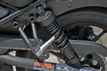 Az acélcsövekből álló váz elég hangsúlyos a motor megjelenésében, technikailag pedig a három ponton felfogatott motorblokkot emelném ki külön, melyből érzésre annyi van meg, hogy kellemes mennyiségű vibráció jön át a lábunk közé vett kéthengeresből. A futóműben nincs semmi nagy trükk, elöl 41 milliméteres becsúszószárakkal ellátott teleszkópok vannak, opcionálisan gumiharmonikás porvédővel, hátra pedig egy pár Showa rugóstag jutott, állítani csak a hátsót lehet a rugó előfeszítésével.