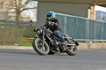 Ez a futómű inkább kényelmes, mintsem sportos, bár /80-as és /90-es gumikkal nem is nagyon lehet más. Kanyarodni szeret a gép, de azért megvannak a korlátai, az alacsony építés, a lapos villaszög és a mélyre szerelt lábtartók. Nekem csak egy-két ismert kanyarban volt olyan érzésem, hogy mindjárt leér róla a lábam vagy a lábtartó, Zomborácz kolléga nagyjából 12 másodperc alatt jutott el a dőlésszög határáig.