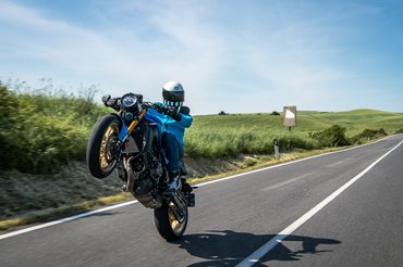 A Bridgestone S22-es gumik azt is bírják, a némi gyakorlattal ügyesen hangolható elektronikával pedig hatásosan tartható távol a hosszú oldal réme. A csomag részét képezi a tempomat is, ami lakott területen pont olyan hasznos tud lenni, mint országúton vagy autópályán. A használhatóságot további extrákkal lehet fokozni. Bár szerintem egy csupasz motort csomaggal csak elrontani lehet, a Weekend Packben is elérhető puha táskák nem ütik agyon a stílust. A Street Pack az optikának kedvez, lámpaidom, fényszórórács, tankgrip és rendszámtartó konzol van benne, a Racer csomagban pedig az állítható karok és egyéb apróságok mellett a feketére eloxált Akrapovic kipufogó a lényeg.