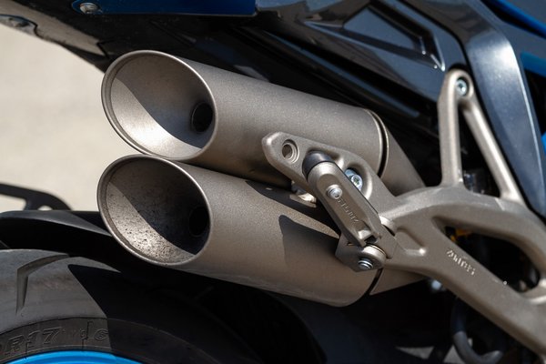 A dizájn fontos része még a jobb oldalra kihúzott, nem túl tolakodó hangú dupla kipufogóvég. Mivel a kettőből csak az egyik volt lekormolódva, először azt hittem, hogy a másik nem is pöfög, csak dísz, aztán járó motorral is szemügyre vettem őket: valóban, az egyik jó nagy lendülettel, a másik meg csak visszafogottan muzsikál. Ennek az az oka, hogy nem szimmetrikusan ágaznak ki a kipufogócsőből: az egyik annak egyenes folytatása, míg a másikat egy útelágazódás kényszeríti visszafogottabb jelenlétre.