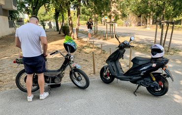 Az első megálló Érd volt, ahol egy szomorú dohányboltban mindig inni szoktunk egy vidám kávét. Nagyon hamar rájöttem, hogy bár készültem erre, az Eko és az F12 közötti tempókülönbség komolyabb probléma, mint vártam. Előbbi végsebessége a kedvétől függ, de valahol 35 és 45 km/h között változik, amihez képest a szintén nem túl erős Malaguti olyan, mint egy S 1000 RR. Az Ekóban még az is remek dolog, hogy ezt a szédületes végsebességet váratlanul hosszú idő alatt éri el.