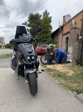 A településről kifele van egy hosszú emelkedő, amin az Eko tempója elég visszafogott volt, és mivel a robogó a gyorsabb, mindig én mentem hátul. Nem meglepő, de a robogó zárt hajtása nem szereti a meleget, ezért olyan időszakban, amikor még a beton is megolvad, kimondottan keserves tud lenni, ha bemelegszik. Viszont ahogy mentünk fel az emelkedőn, a szokásosnál is rosszabbnak tűnt, egyáltalán nem szeretett volna reagálni a gázra.