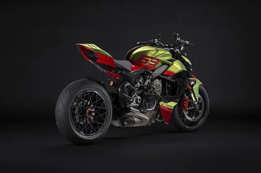 A mostani Streetfighter V4 Lamborghini esetében a kapcsolódási pont a Volkswagen-csoporthoz tartozó sportkocsigyár Huracán STO modellje. A limitált Ducati sajátos, Verde Citrea elnevezésű metálzöld fényezést kapott, Arancio Dac narancsszínű betétekkel. Ott figyel a tankon a 63-as szám is, amely az olaszok MotoGP-menőjének, Pecco Bagnaiának a rajtszáma, de nemcsak ezért visszatérő motívum: utal a Lamborghini 1963-as alapítására is.