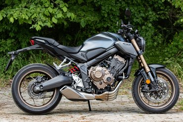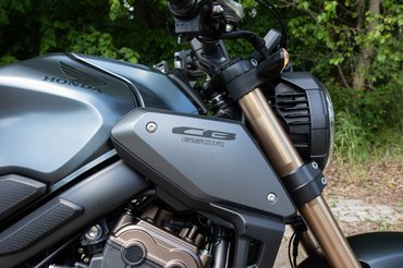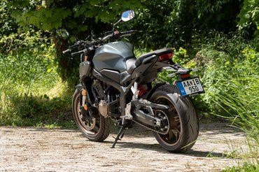A csupasz változathoz tartozó anyagban már lejjebb tekerték a bullshit-generátort. Csupán akkor szisszenek fel, amikor a streetfighter motorokkal akarják rokonságba hozni a CB650R-t (meg amikor az elegáns rendszámtábla-tartót emlegetik), mert a hosszú egyes és kettes fokozataival (másodikban 130-nál van a vége), meg az egykerekező hajlamának lényegében hiányával minden, csak nem utcai harcos. És megint: ez nem baj, mert ez egy városban és városon kívül is kényelmesen használható, a hagyományos sornégy karakterrel szemben a középtartományban is szépen dolgozó naked. Csak akkor minek ez a streetfighterezés? Hagyjuk már...