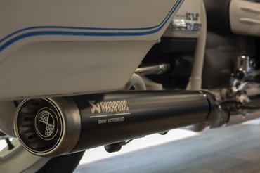 Ezt a patinásított fehér R18-at a magyar Moto Jungle műhelyben építették, felkérésre, de kizárólag gyári BMW-kiegészítőként elérhető cuccokkal, hogy a műszakiztatással se legyen gond. A BMW-logót mintázó kipufogóvég nagyon sok R18-on látható, ez viszont itt egy járós autó árába kerülő Akrapovic rendszer, a dobozok pedig ugyan az R18 Transcontinental gyári dobozai, az azonos név ellenére a vázkialakítás más volt a két motoron, így ezek a dobozok is elég sok munkaórával kerülhettek fel rá.