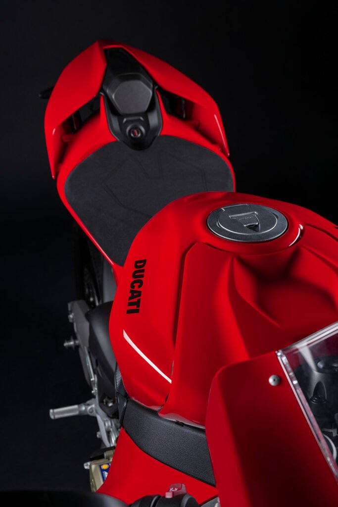 A nagyobb nyereg mellett további olyan változásokat eszközöltek a Ducatinál, ami segít jobban eggyé válni a motorosnak a motorral. A tank forma két ponton változott. Egyrészt kialakítottak egy bemélyedést a tartály felső felületének kormányhoz közel eső részén, ami azt a célt szolgálja, hogy rendesen meghasalva a Panigale V4-et a sisak állcsúcsa kisebb eséllyel kerüljön kontaktba vele.