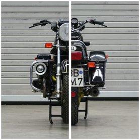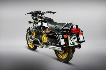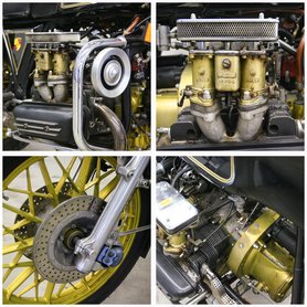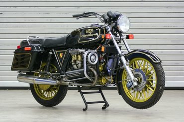 Restaurálni nem kellett, hiszen tizen párezer kilométert futhatott csupán – legalábbis a kilométerszámlálója ennyit mutat. Persze lehet, hogy ez még az eredeti motorkerékpár futásteljesítménye. A váza ugyanis egy főleg BMW motorkerékpár elemekből egyedileg készített váz, amikre szintén főleg müncheni kiegészítőket szerelt a műszerészként dolgozó, Kielben lakó Hess. A hajtás BMW kardántengelyen keresztül történik, bajor a teleszkópvilla és a műszerek is. A benzintankról nem áll rendelkezésre információ, szerintem az is BMW eredetű. A festés ugyancsak Heß munkája – a fekete-arany mintázat ugye egy, a korban ismert dohánymárka színösszeállítása, ilyen festéssel futottak a Lotus Formula-1 futamokon rajthoz álló gépei a 80-as évek elején. Nagyon elegáns és szép színkombináció.