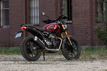 Hurkás üléssel, gumipárnás tankkal, felhúzott kipufogóval és mézsárgára eloxált első villával szépen eltalálták a scrambler stílus legfontosabb jegyeit és rendesen eltávolodtak a Speed 400 semmilyenségétől. A motorhoz közeledve nem hiányzik belőle az az 500-800 köbcenti, amennyivel a nagyok többet kínálnak, bár azoknak megint más a stílusa és jól néznek ki – a Triumph érzi a scrambler műfajt.