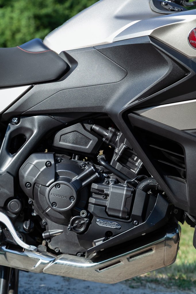 De ez nem azt jelenti, hogy nem lehet vele tisztességeset haladni. 1084 köbcentit, 101 lóerőt (7500-as fordulaton) és 112 Nm forgatónyomatékot (ez 5500-as fordulaton érkezik) még mindig nem illik félvállról venni, és hiába nem suttogja fülembe a rosszaságot, az egy masszív erőmag, ami ezres túramotorhoz illően indítja meg a DCT-vel 248 kilós tömeget. 180? 200? Nem téma. Hegynek fel? Nem téma. Két személy és sok csomag? Nem téma. Azért a régi bölcselet még mindig él: a vonóerő a köcsögből érkezik, szóval ott lakik a nagy köbcentiben a póver akkor is, ha azt hinnénk, le van csavarva a potméter. Kicsit olyan, mint a mosonmagyaróvári edzőteremben a Kiss Laci bácsi, aki bőven nyugdíjkorhatár után is felhúzott 170-180 kilót, ha kicsit nekiveselkedett.