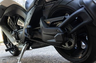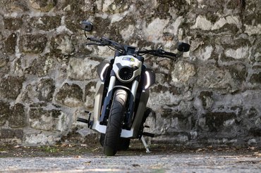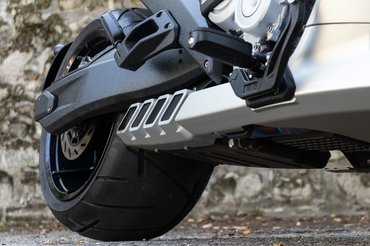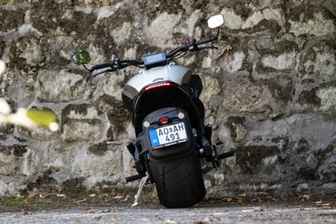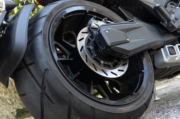 Pedig látszólag tervezési alapelv volt a több a soknál. Ezt mi sem bizonyítja jobban, hogy míg elöl hagyományosnak mondható 130/70-es abroncs feszül egy 19-es felnin, addig hátra egy elfektetett boroshordó jutott. A 18-as alufelni olyan széles, hogy a küllők mindkét oldalán meg lehetne teríteni egy parasztreggelihez, az abroncs pedig 310/35, tehát 31 centi széles. Ez minden hátsó szögéből eladja a motort, de ezzel nincs vége a furcsaságoknak.