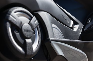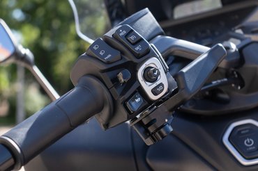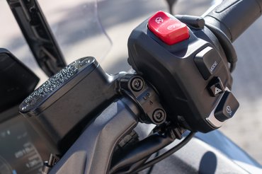 A kormány zsúfolt – első pillantásra nem tudtam, hogy hova nyúljak és miért. Annak örülök, hogy a Tmaxon a Yamaha még nem sütötte el a billenőkapcsolós indexnek nevezett merényletet. Egy hagyományos gomb van a fedélzeti rendszer joystickja mellett, amit én a rövid ujjaimmal nem mindig értem el. Ha nem néztem le menet közben, akkor előfordult, hogy az index helyett a szélvédő magasságát állítottam – elektromosan, akár 11 centit –, ami izgi extra, csak sorolásnál nem hasznos. A bal kezelőfelület kicsit sok, a kézifék, a duda és a tempomat is idekerült, a gyors reakció gyakorlás kérdése. Volt, akit véletlen ledudáltam, pedig csak a menüt szerettem volna piszkálni – innen is bocsánatot kérek!