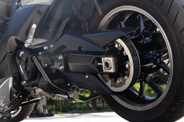 Nem is a nettó sebesség, de a motor bő kétmázsás súlya miatt is indokolt, hogy elöl két 267, hátul egy 282 milliméteres féktárcsára húzták a Yamaha négydugattyús – hátul egydugattyús –, radiális nyergeit. A fékkarok útja kiszámítható, sportmotoros adagolhatóságot nyújt a rendszer, egyedül a Tmax súlyát nem kompenzálják, így érezhetően többet kívánnak a karok, mint oldalanként egy-egy ujj. Ebben a kategóriában ez nem meglepő, érdemi motorfék hiányában amúgy is többet dolgozik az ember az üzemi fékekkel, de ez a Tmaxon kellemes.